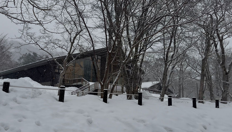 The building’s warm interior lights glowed faintly through large windows, offering a cozy contrast to the cold outside. Snow clung to tree branches overhead, and flakes continued drifting down, making the entire scene quiet and peaceful. It felt like walking through a winter postcard.